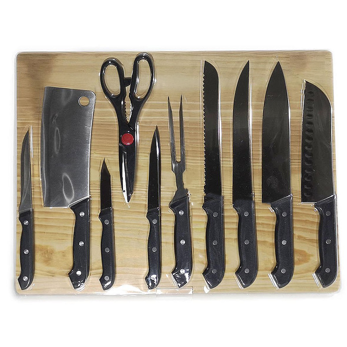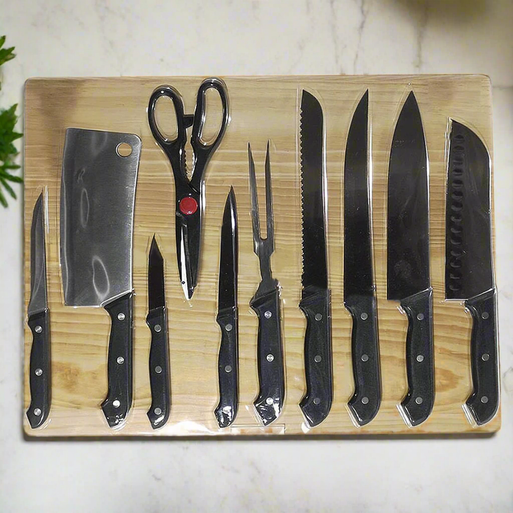 Enhance your kitchen with the 11-piece knives set featuring a premium wooden cutting board. Each knife is crafted for precision and durability, making food preparation effortless and efficient. The wooden cutting board offers a reliable, knife-friendly surface that preserves blade sharpness while providing a natural, sturdy workspace. This perfect combination turns every meal prep into an enjoyable, seamless experience—equip your kitchen with quality tools designed to last and perform.