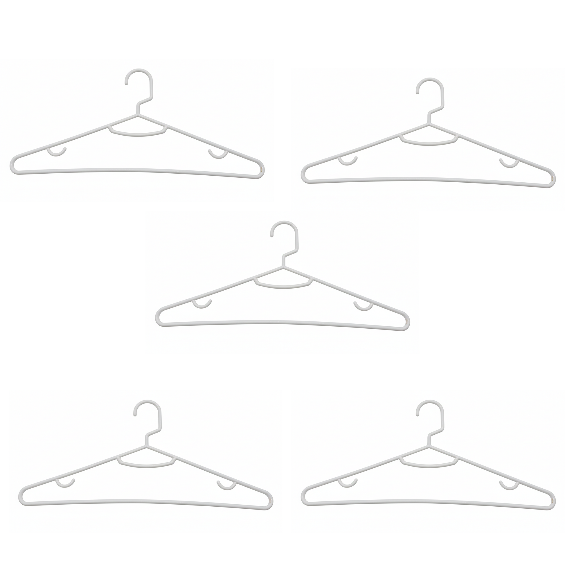 Set of 5 white hangers designed to maximize your closet space efficiently. Each hanger measures 40x19x0.6cm, offering a slim profile that lets you fit more garments without clutter. The clean white finish complements any wardrobe aesthetic while the durable construction ensures reliable support for your everyday clothing. Perfect for organizing shirts, blouses, and lightweight garments with ease.
