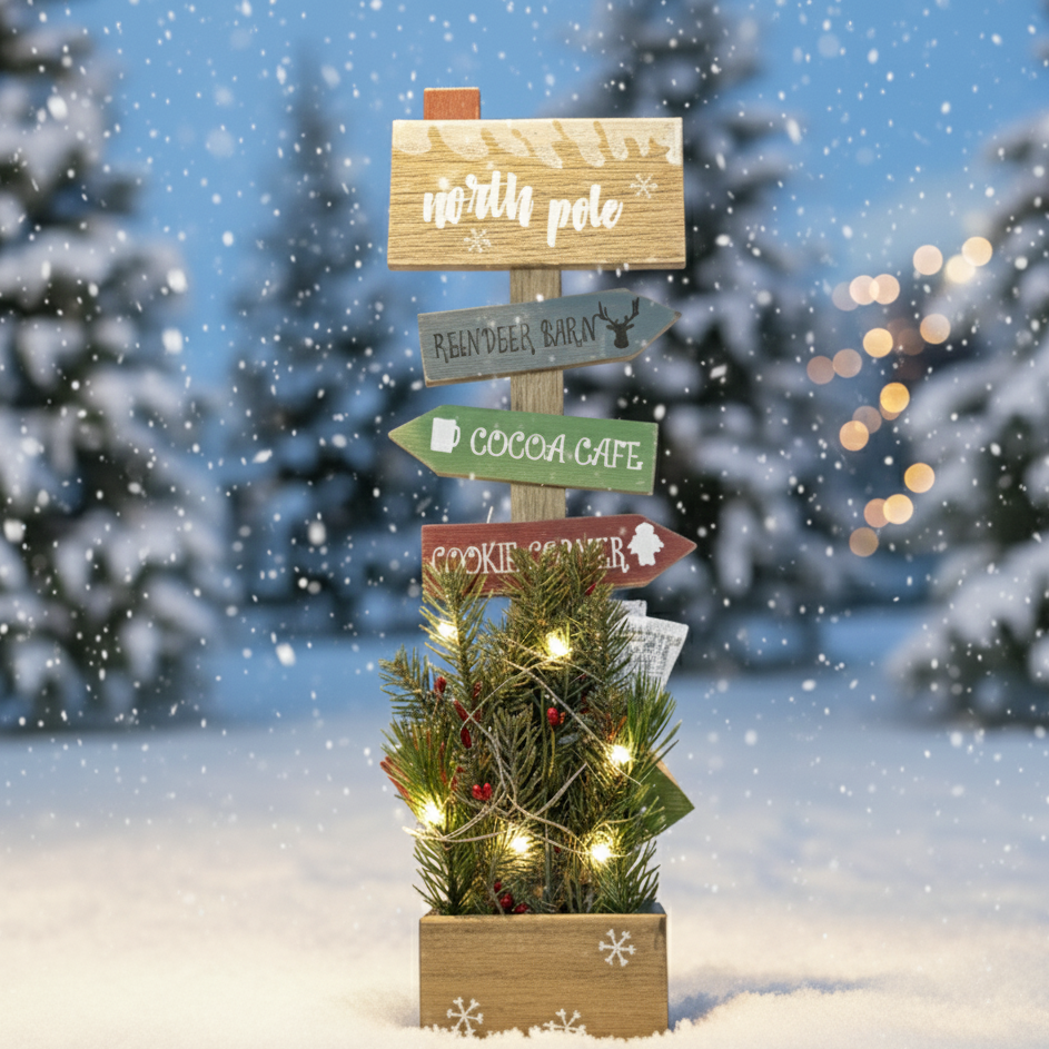 Welcome guests with rustic charm using this delightful Address Poster. Standing at 15x7x4cm, this natural wood signpost features authentic directional arrows and decorative pine branches that evoke the whimsy of the North Pole. The integrated LED pick bathes your entryway in a warm, inviting glow, transforming it into a festive focal point. Ideal for holiday displays, seasonal décor, or year-round enchantment, this piece combines practical wayfinding with decorative elegance.