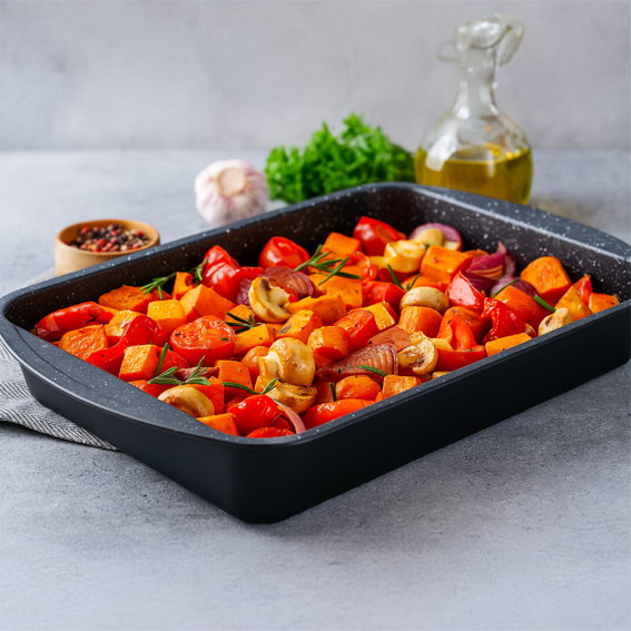 This baking pan, measuring 45.5 x 30 x 7 cm, offers ample space for your favorite recipes. Its generous size ensures even baking and easy handling, making it ideal for cakes, casseroles, and more. Durable and practical, it helps you achieve perfect results every time in your kitchen.