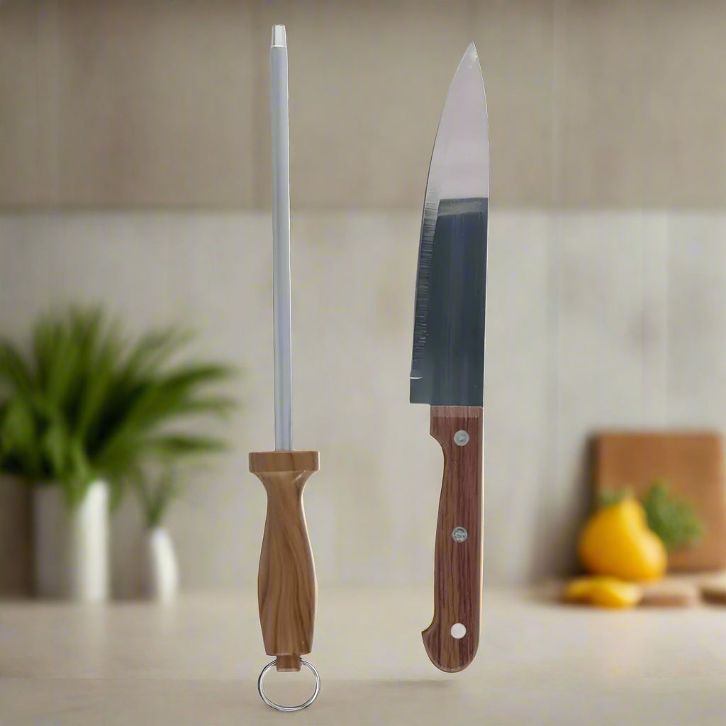 Enhance your grilling precision with this 30cm BBQ Knife & Sharpener set. The long, sharp blade effortlessly slices through meat, making every cut clean and controlled. Included sharpener maintains the knife’s edge for consistent performance, ensuring you're always ready to serve perfect BBQ dishes. Perfect for any grill master seeking quality and efficiency.