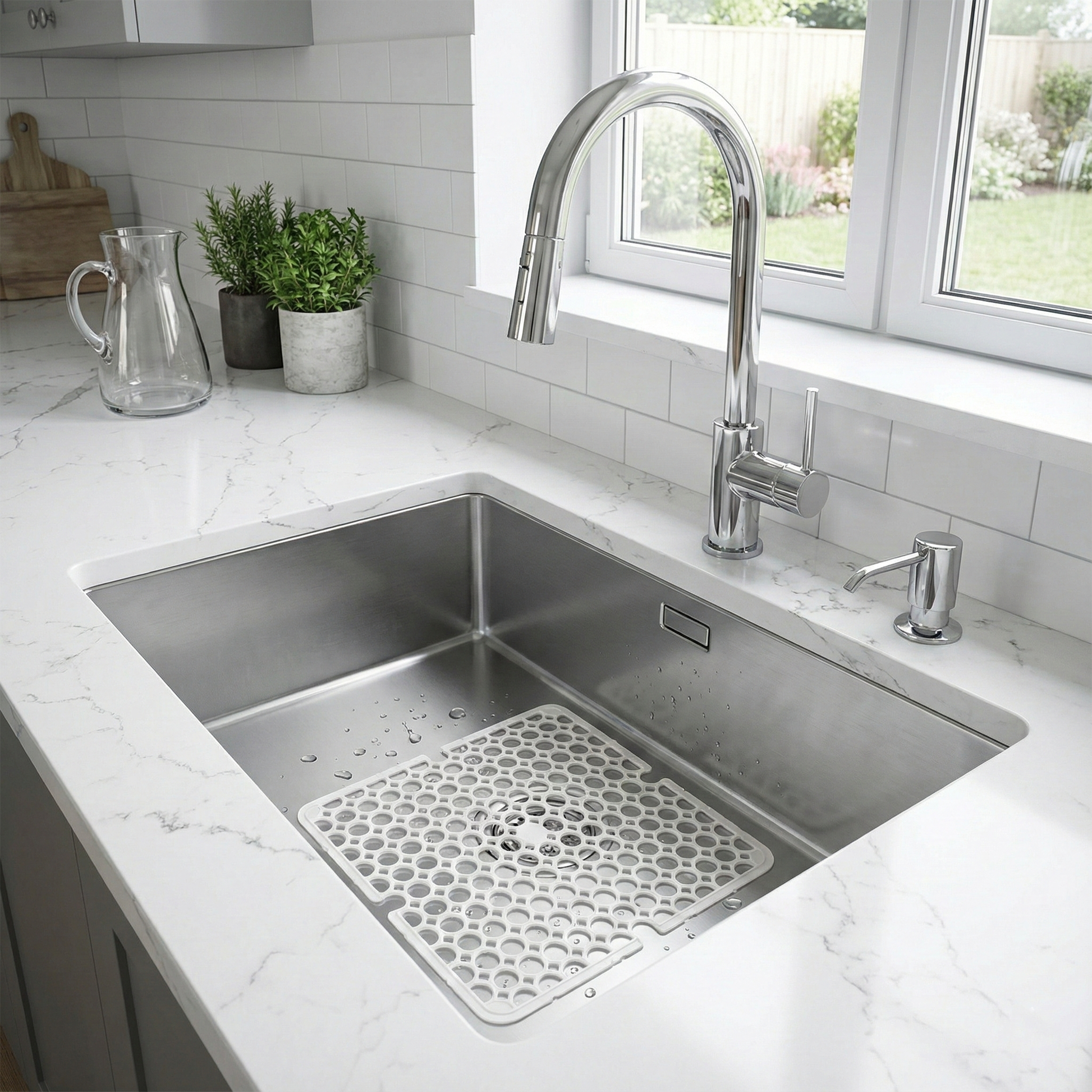 Protect your sink and dishes with this durable 30x30cm sink mat. Designed to fit most standard sinks. Its non-slip surface keeps items securely in place while allowing water to drain easily, keeping your sink clean and dry. Enhance your kitchen’s functionality with this simple yet essential accessory.