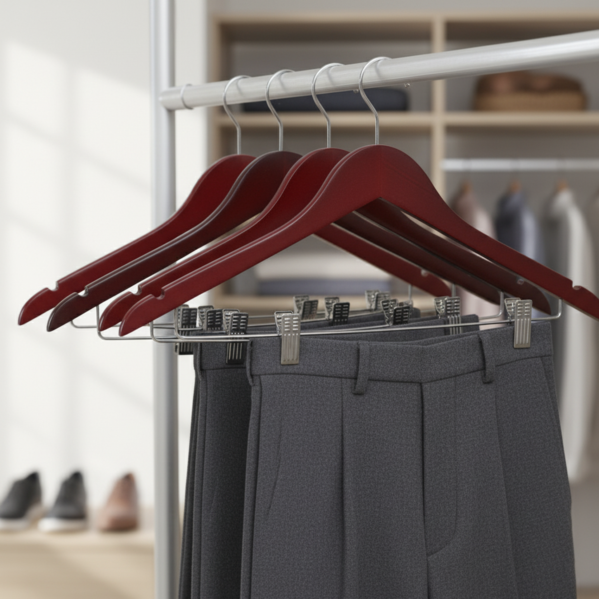 Keep your wardrobe organized with this practical set of three wooden hangers featuring secure clips. Crafted from quality wood, these hangers combine durability with a natural aesthetic that complements any closet. The integrated clips grip garments firmly without slipping, making them ideal for pants, skirts, and delicate items. A reliable choice for everyday use that brings both functionality and style to your storage solutions.
